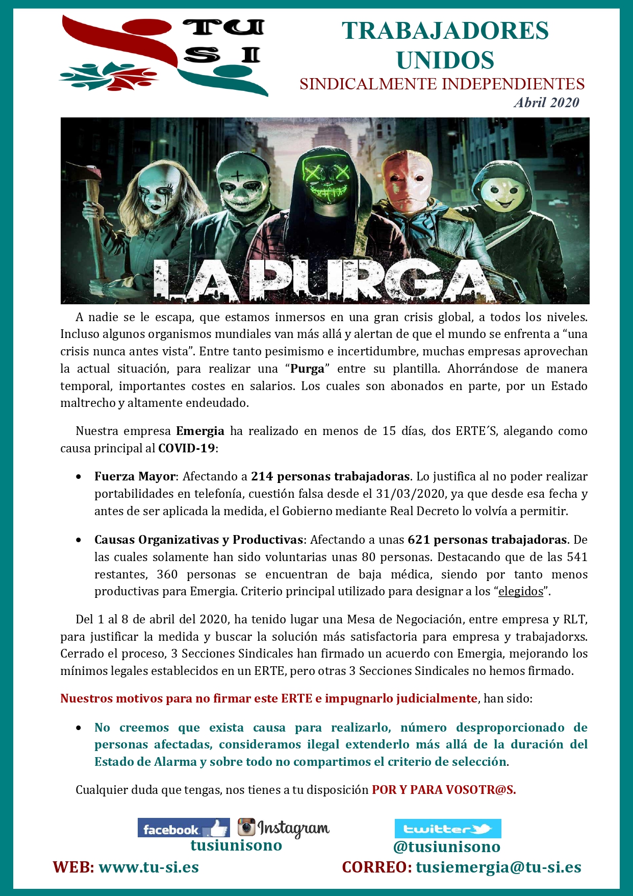 Nuestra empresa Emergia ha realizado en menos de 15 días, dos ERTE´S, alegando como causa principal al COVID-19. . .