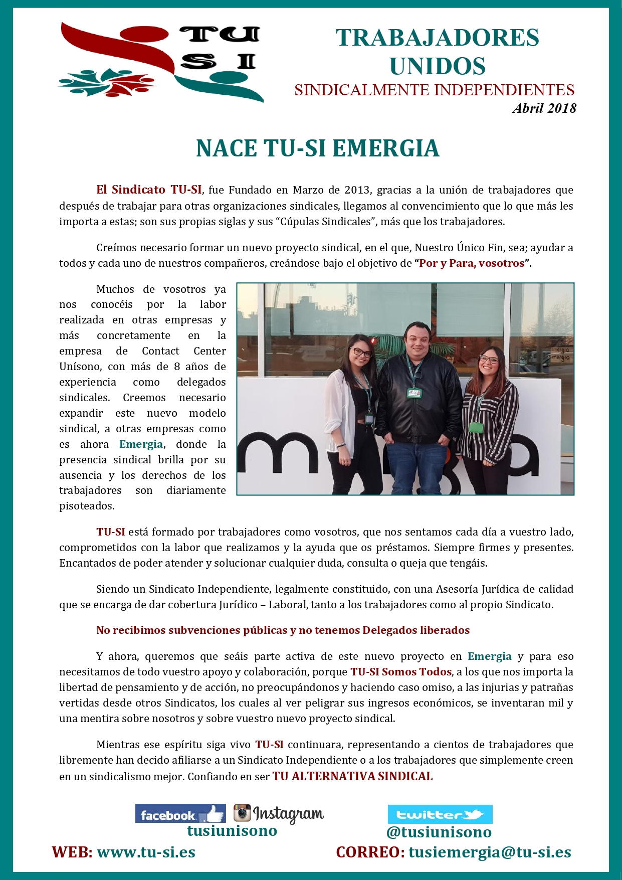 Con mucha ilusión empezamos este nuevo proyecto, en una nueva empresa de Contac Center, con las mismas ganas e ilusión que cuando empezamos en el 2013, pero con la madurez y las ganas de hacer un sindicalismo accesible a todos, donde lo realmente importante eres tu como trabajador