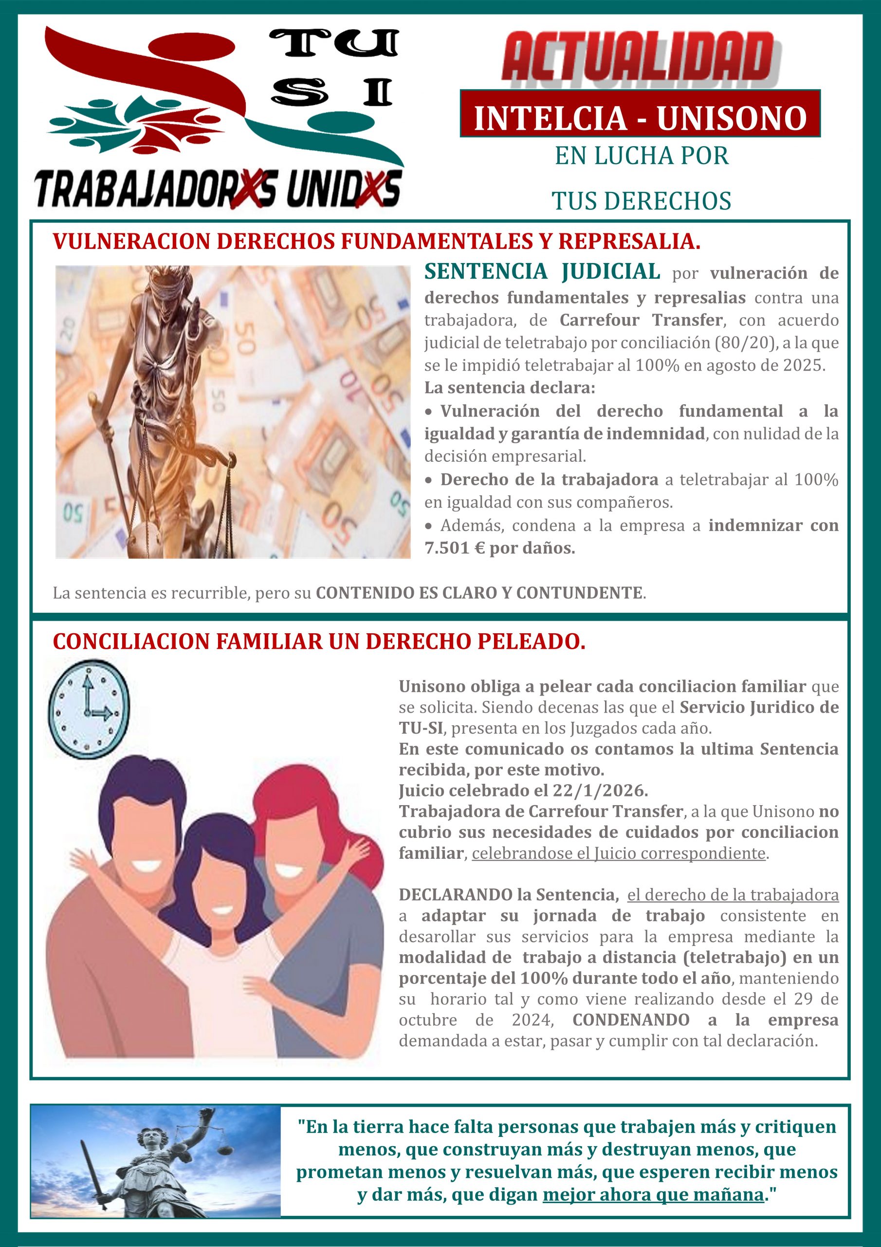 Además aprovechamos para informaros de un par de sentencias relativas a la conciliación familiar. Ya que Unísono obliga a pelear cada conciliación familiar en el juzgado, siendo decenas las que el Servicio Jurídico de TU-SI, presenta en los Juzgados cada año.