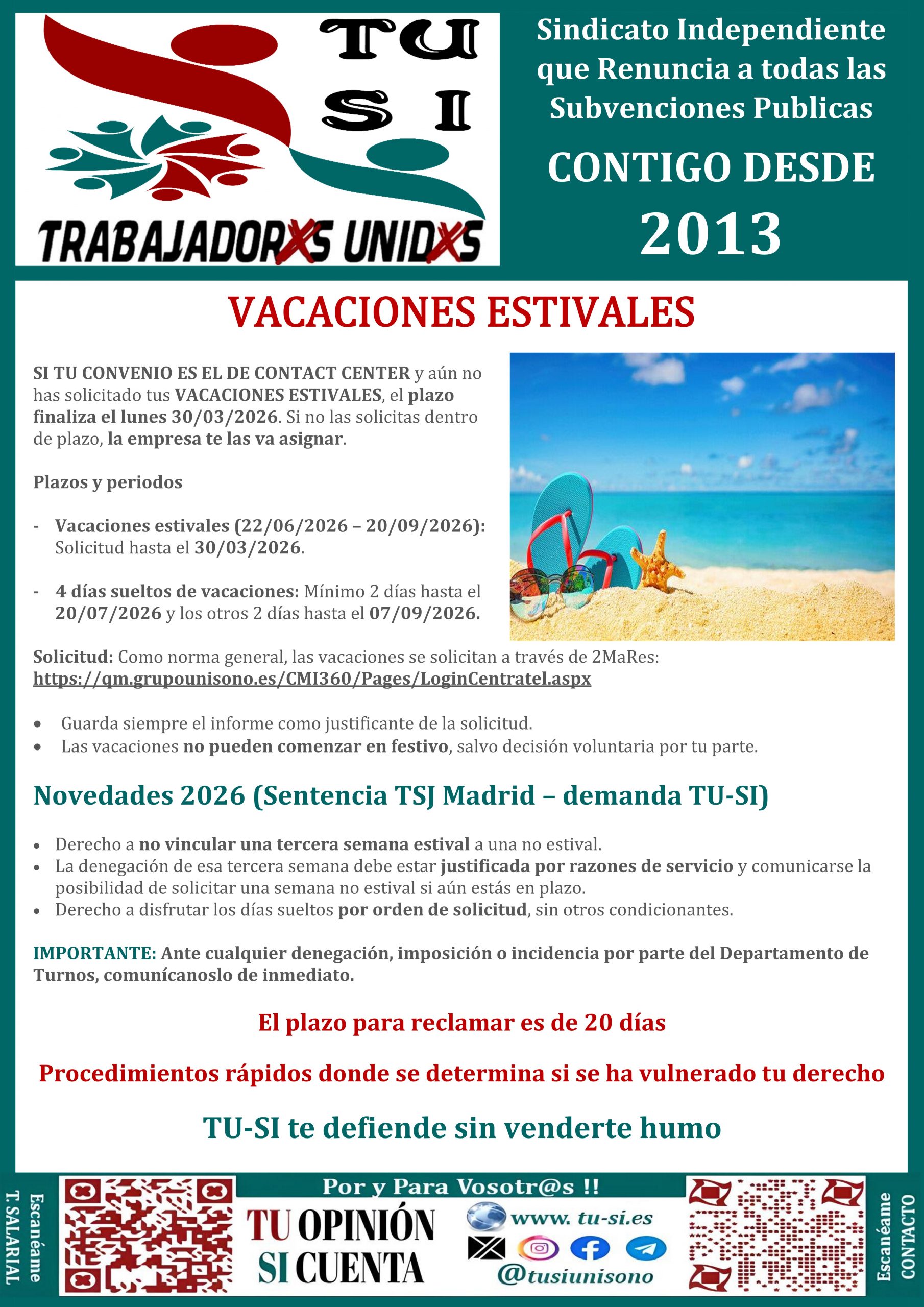 SI TU CONVENIO ES EL DE CONTACT CENTER y aún no has solicitado tus VACACIONES ESTIVALES, el plazo finaliza el lunes 30/03/2026. Si no las solicitas dentro de plazo, la empresa te las va asignar.